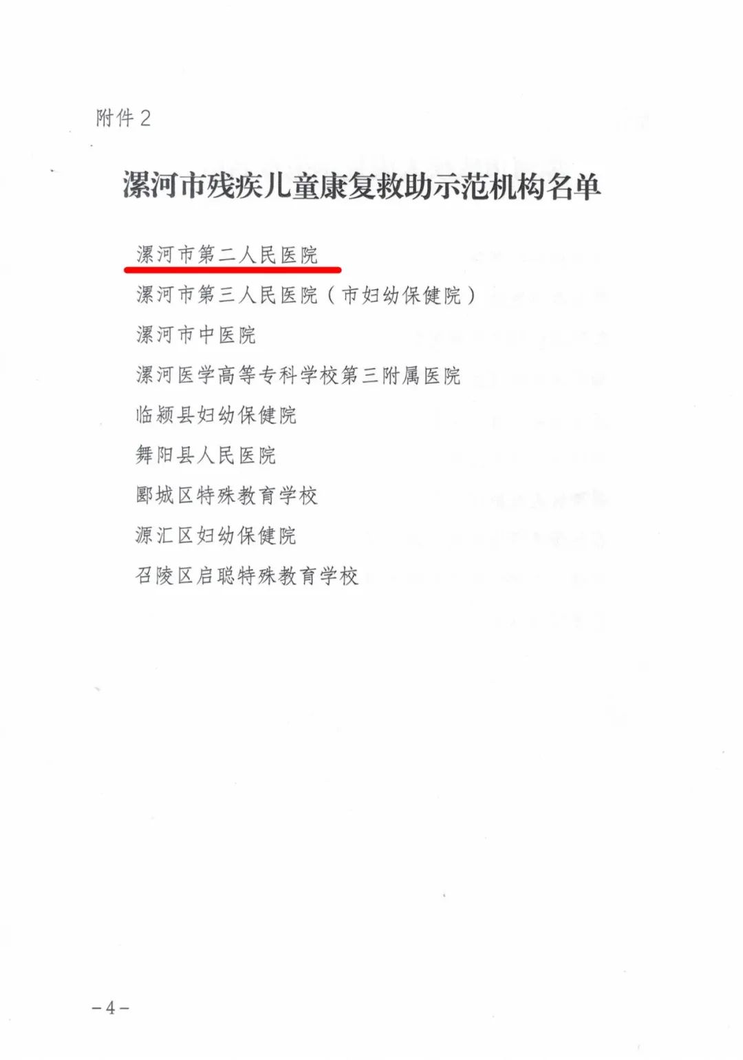 11月21日,根據(jù)《關于開展漯河市殘疾人康復示范點和殘疾兒童康復救助示范機構(gòu)創(chuàng)建活動的通知》要求,經(jīng)機構(gòu)自薦申請、市殘聯(lián)復審等各環(huán)節(jié)工作,市二院被漯河市殘疾人聯(lián)合會命名為市殘疾兒童康復救助示范機構(gòu)。