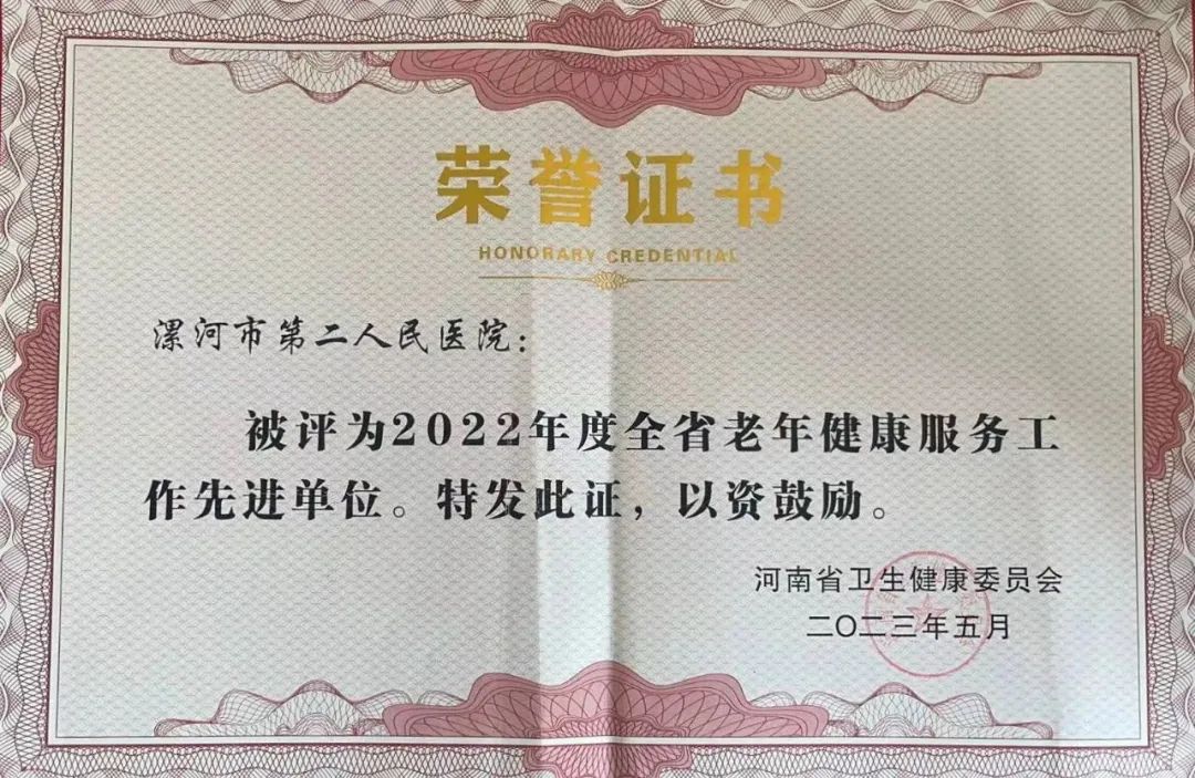 5月31日,河南省衛(wèi)生健康委發(fā)布關于表彰2022年度全省老齡工作和老齡健康工作先進單位、先進個人的通報,市二院榮獲“2022年度全省老年健康服務工作先進單位”殊榮。