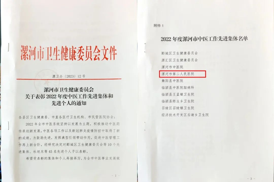 3月2日,市二院被市衛(wèi)健委授予2022年度漯河市中醫(yī)工作先進集體榮譽稱號。