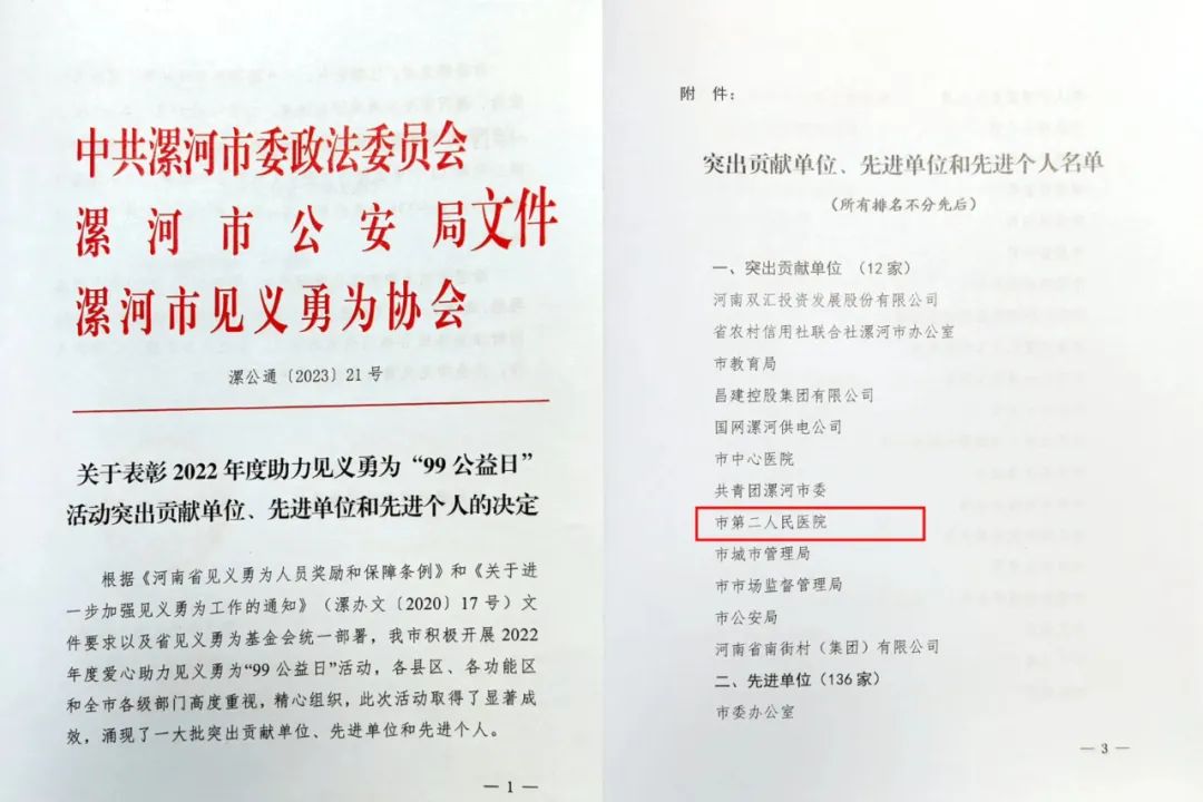 3月29日上午,漯河市見義勇為工作暨“99公益日”表彰會議召開,市二院被授予助力見義勇為“99公益日”活動“突出貢獻單位”。
