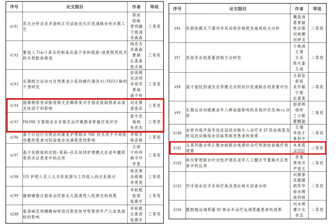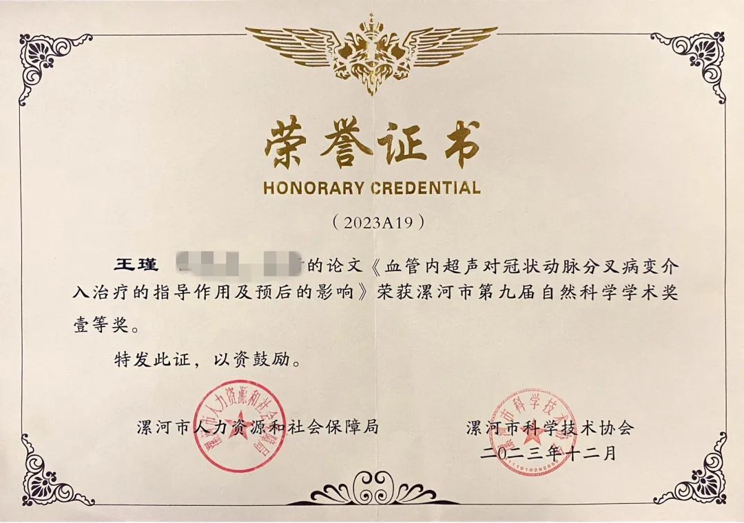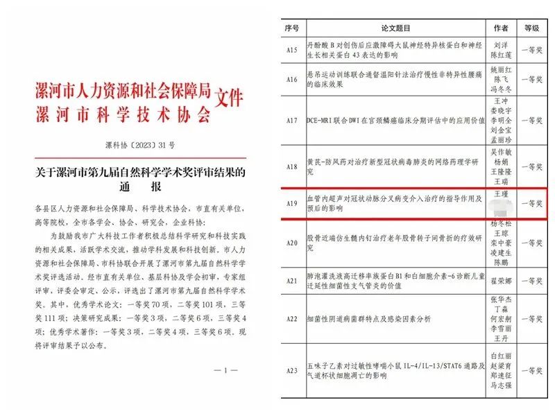 近日,漯河市人力資源和社會(huì)保障局、漯河市科學(xué)技術(shù)協(xié)會(huì)公布漯河市第九屆自然科學(xué)學(xué)術(shù)獎(jiǎng)優(yōu)秀學(xué)術(shù)論文評(píng)選結(jié)果。市二院院長(zhǎng)王瑾《血管內(nèi)超聲對(duì)冠狀動(dòng)脈分叉病變介入治療的指導(dǎo)作用及預(yù)后的影響》、《血管內(nèi)超聲指導(dǎo)經(jīng)皮冠狀動(dòng)脈介入治療非 ST 段抬高型急 性冠狀動(dòng)脈綜合征臨界病變患者的效果》分別榮獲一等獎(jiǎng)和二等獎(jiǎng);中醫(yī)針灸科主任朱青霞《玉屏風(fēng)散合牽正散加減聯(lián)合透滯針治療周圍性面癱療效觀察》榮獲二等獎(jiǎng);腫瘤科副主任醫(yī)師翟中武《FOLFOX 方案聯(lián)合吉非替尼治療晚期食管癌療效評(píng)價(jià)》、顯微外科主治醫(yī)師劉東博的《指掌側(cè)固有動(dòng)脈背側(cè)支皮瓣修復(fù)對(duì)手指皮膚缺損者血清炎性因子的影響》榮獲三等獎(jiǎng)。