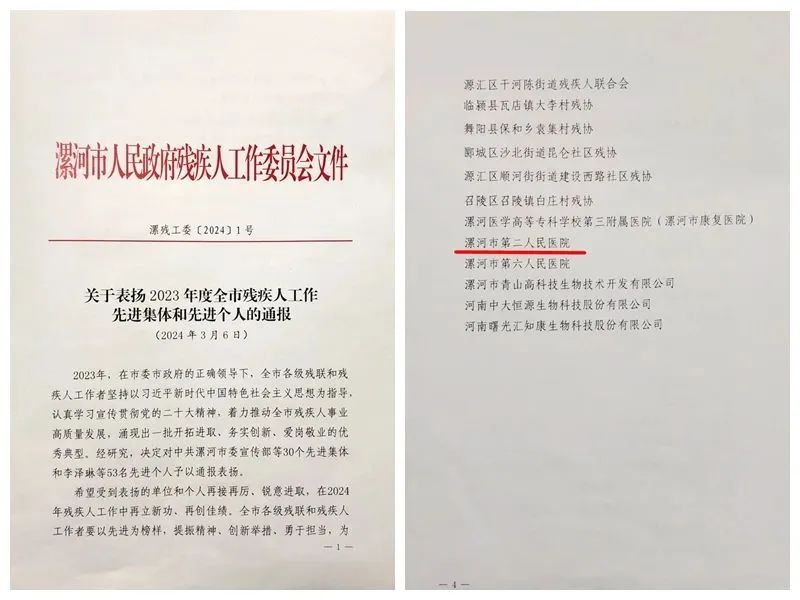 3月6日,漯河市人民政府殘疾人工作委員會(huì)發(fā)布《關(guān)于表揚(yáng)2023年度全市殘疾人工作先進(jìn)集體和先進(jìn)個(gè)人的通報(bào)》,市二院榮獲“2023年度全市殘疾人工作先進(jìn)集體”榮譽(yù)稱號。