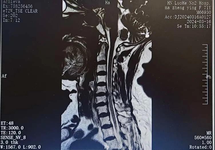 近日,70歲的馬阿姨,因摔傷后出現(xiàn)持續(xù)性頸部疼痛伴右側肢體無力、麻痛,影響日常生活。于是來到市二院神經外科就診,經檢查發(fā)現(xiàn):頸椎MR示:頸3/4、4/5、5/6、6/7椎間盤變性突出(中央型)并繼發(fā)性椎管變窄,頸椎退行性改變,頸5椎體水平頸髓水腫。神經外科副主任劉沛濤根據(jù)患者癥狀、體征、影像學三者結合診斷為“脊髓型頸椎病”,考慮到患者癥狀逐漸加重、保守治療效果不佳等情況,建議盡快手術治療。