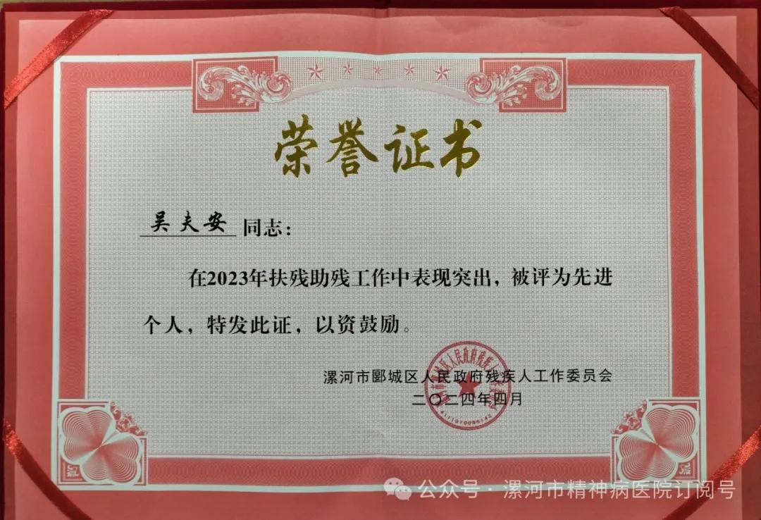 2024年4月24日上午,在漯河市郾城區(qū)殘聯(lián)“關(guān)于表彰2023年度全區(qū)殘疾人工作先進(jìn)集體和先進(jìn)個(gè)人”表彰會(huì)議中,漯河市精神病醫(yī)院獲得“2023年度扶殘助殘工作先進(jìn)集體”,吳夫安同志在2023年度扶殘助殘工作中表現(xiàn)突出被評(píng)為“先進(jìn)個(gè)人”榮譽(yù)稱(chēng)號(hào)。