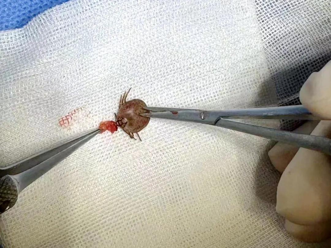 44歲的馬女士,3天前曾在南陽山地茶園采摘春茶,不知不覺中被蜱蟲咬傷右側大腿內側,因局部疼痛,同行人員幫忙查看發(fā)現有一個黑色的“小圓粒”,以為是皮膚上長了疣,后來發(fā)現異物長有多條腿,并且會蠕動。因此種情況不是十分常見,馬女士回家后輾轉多家醫(yī)院診治均無法取出。