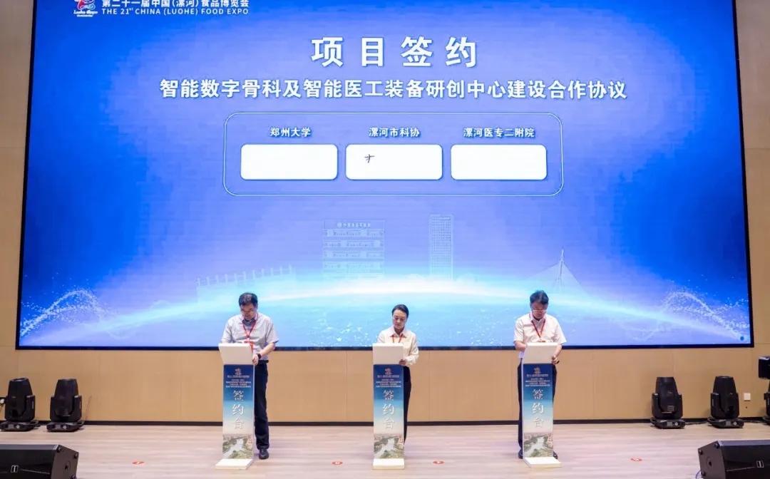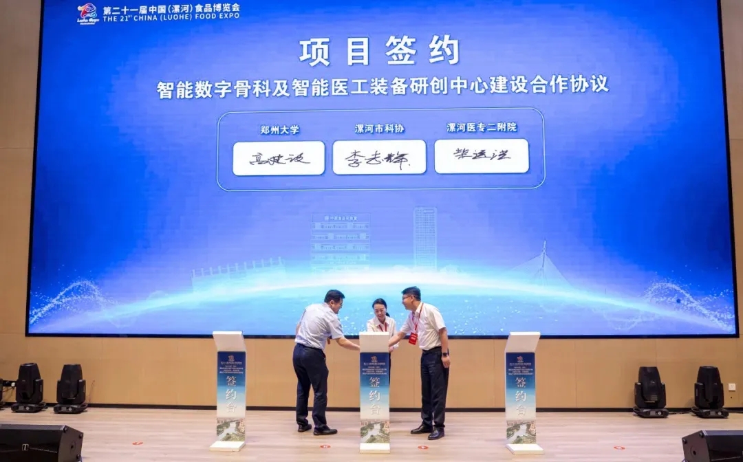 開(kāi)幕式現(xiàn)場(chǎng),漯河市骨科醫(yī)院(漯河醫(yī)專(zhuān)二附院、漯河市立醫(yī)院)黨委書(shū)記柴運(yùn)洪與鄭州大學(xué)機(jī)械與動(dòng)力工程學(xué)院院長(zhǎng)、教授高建設(shè),漯河市科協(xié)黨組書(shū)記、主席李志輝簽訂了智能數(shù)字骨科及智能醫(yī)工裝備研創(chuàng)中心建設(shè)合作協(xié)議。