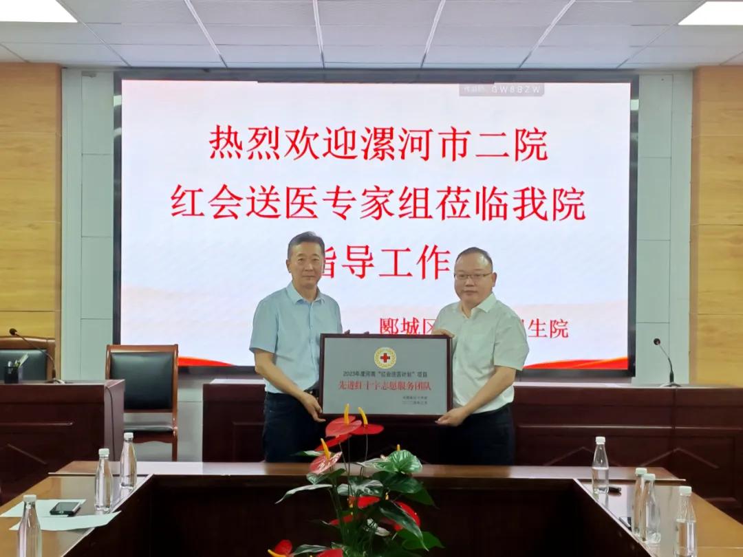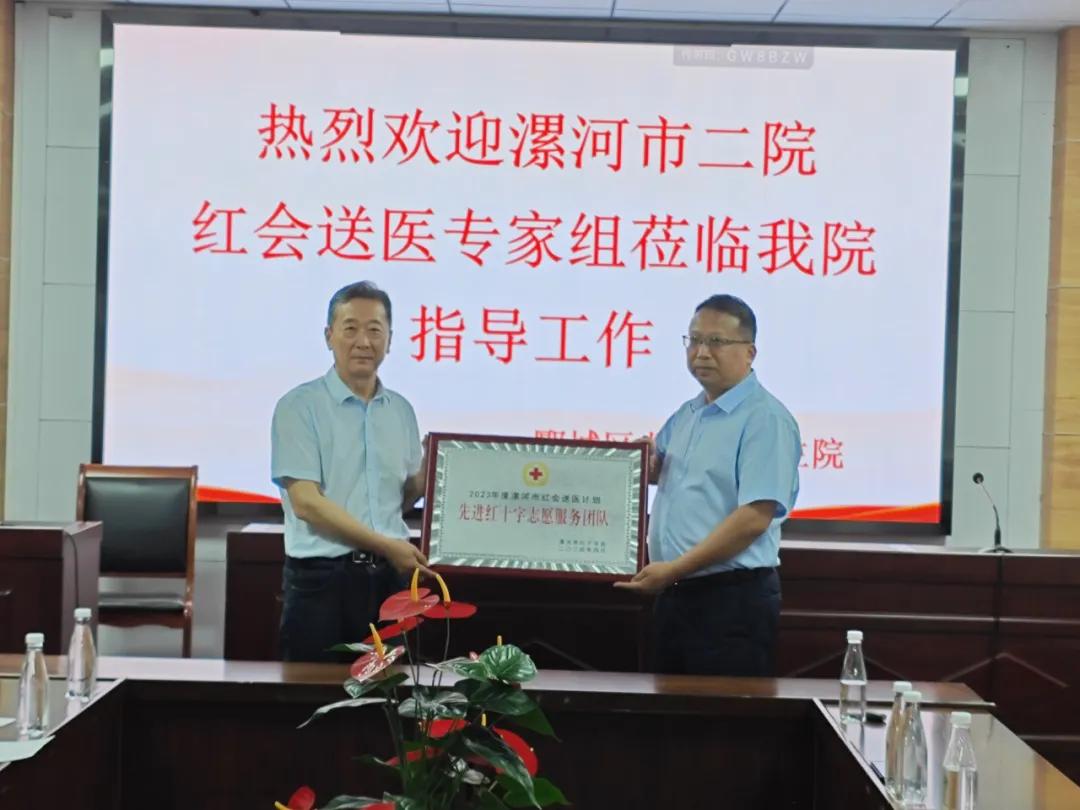 漯河市紅十字會(huì)黨組成員、副會(huì)長劉國防,市二院副院長張曉東,市二院工會(huì)主席李世學(xué),郾城區(qū)紅十字會(huì)副會(huì)長李山峰,龍城鎮(zhèn)衛(wèi)生院相關(guān)負(fù)責(zé)同志出席了本次對接會(huì)議和義診活動(dòng)。對接會(huì)上,市紅會(huì)副會(huì)長劉國防對市二院“紅會(huì)送醫(yī)計(jì)劃”所做的工作表示了高度的肯定,并向醫(yī)院頒發(fā)了2023年河南省“紅會(huì)送醫(yī)計(jì)劃”先進(jìn)單位、2023年漯河市“紅會(huì)送醫(yī)計(jì)劃”先進(jìn)單位兩塊獎(jiǎng)牌,對市二院李慧新等7名同志獲得省級和市級“優(yōu)秀紅十字醫(yī)療專家志愿者”稱號表示祝賀。