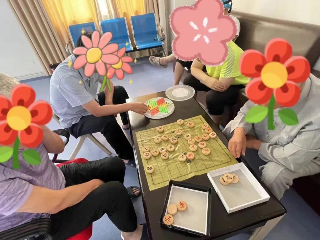 走進(jìn)活動(dòng)室我們首先看到的是有的患者手中拿著筆,在信紙上認(rèn)真地傾訴著自己的內(nèi)心世界,意為發(fā)泄,也是與自己的一次和解。有的患者則在醫(yī)務(wù)人員的指導(dǎo)下,制作手工藝品,從一開始的笨拙生疏,到漸漸的熟練流暢,他們的作品從無到有,從簡(jiǎn)到繁,無不展現(xiàn)出獨(dú)特的創(chuàng)意和個(gè)性。更有兩兩對(duì)坐的患者在棋局上戰(zhàn)得酣暢淋漓,快意人生。對(duì)于愛運(yùn)動(dòng)的患者,我們工娛護(hù)士則跟著視頻課程帶領(lǐng)大家揮灑汗水,恣意瀟灑。