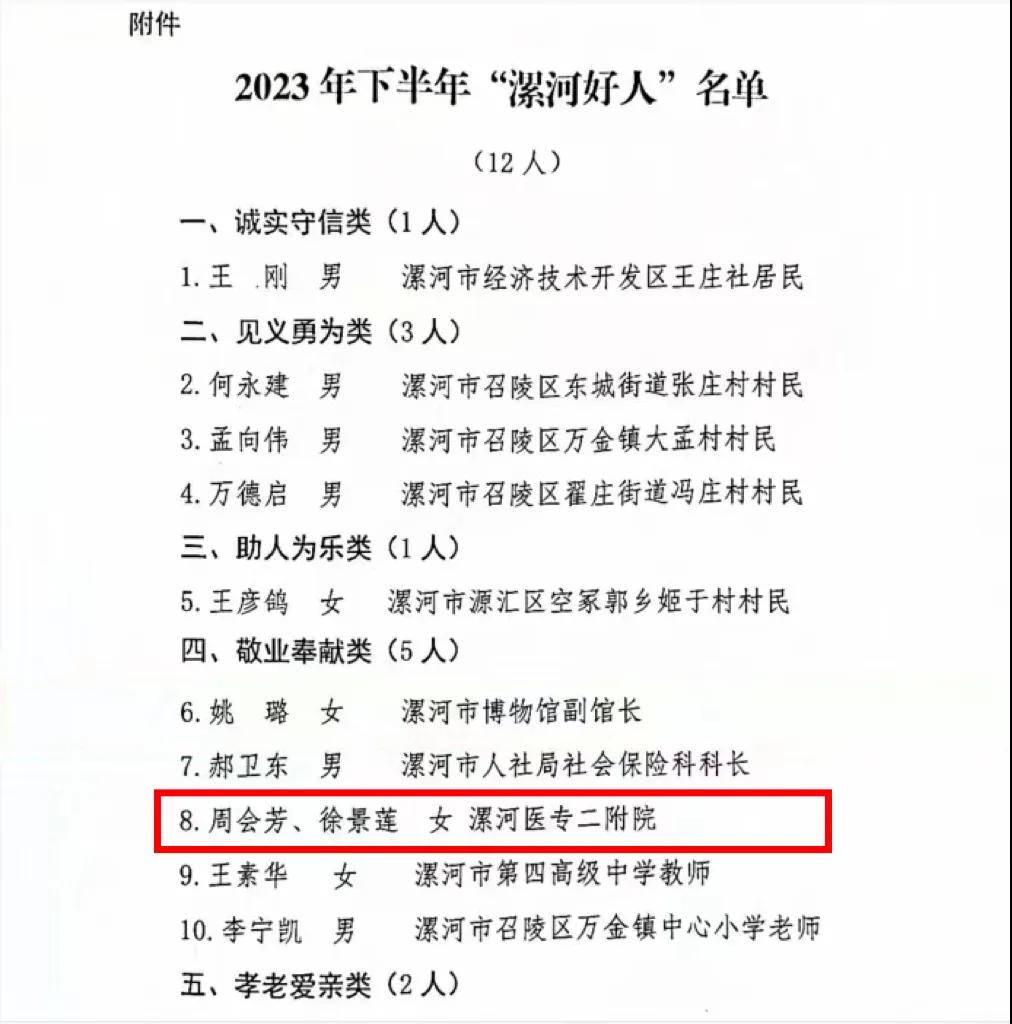 其中,來自漯河市骨科醫(yī)院(漯河醫(yī)專二附院、漯河市立醫(yī)院)的周會(huì)芳、徐景蓮光榮入選2023年下半年“漯河好人榜”!