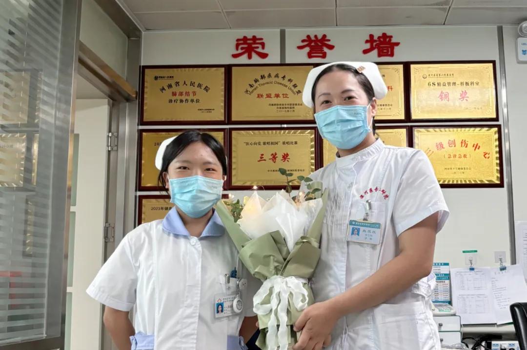 “趙老師,馬上就要轉(zhuǎn)科,真舍不得你,舍不得胸外科”,胸外科實(shí)習(xí)生龐晶晶依依不舍地對(duì)帶教老師趙蕊蕊說(shuō)道,更是送上鮮花表達(dá)感謝。