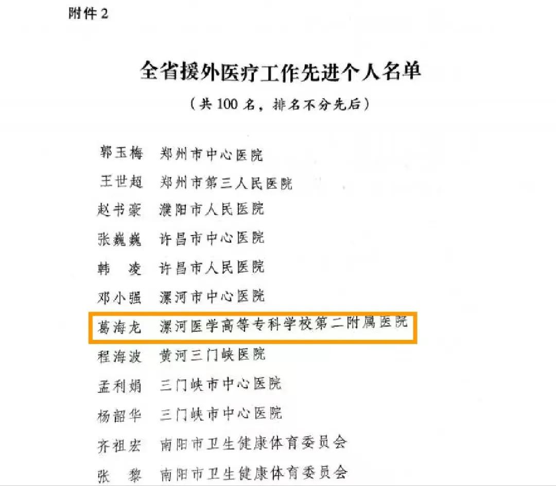 在紀(jì)念河南省承派援外醫(yī)療隊(duì)50周年的重要時(shí)刻,為表揚(yáng)先進(jìn)、樹立楷模,省衛(wèi)生健康委隆重舉行紀(jì)念大會(huì),對(duì)包括援埃塞俄比亞中國(guó)醫(yī)療隊(duì)群體在內(nèi)的47個(gè)優(yōu)秀集體以及100名杰出個(gè)人進(jìn)行了通報(bào)表揚(yáng)。其中,漯河市骨科醫(yī)院(漯河醫(yī)專二附院、漯河市立醫(yī)院)葛海龍榮獲全省援外醫(yī)療工作先進(jìn)個(gè)人!