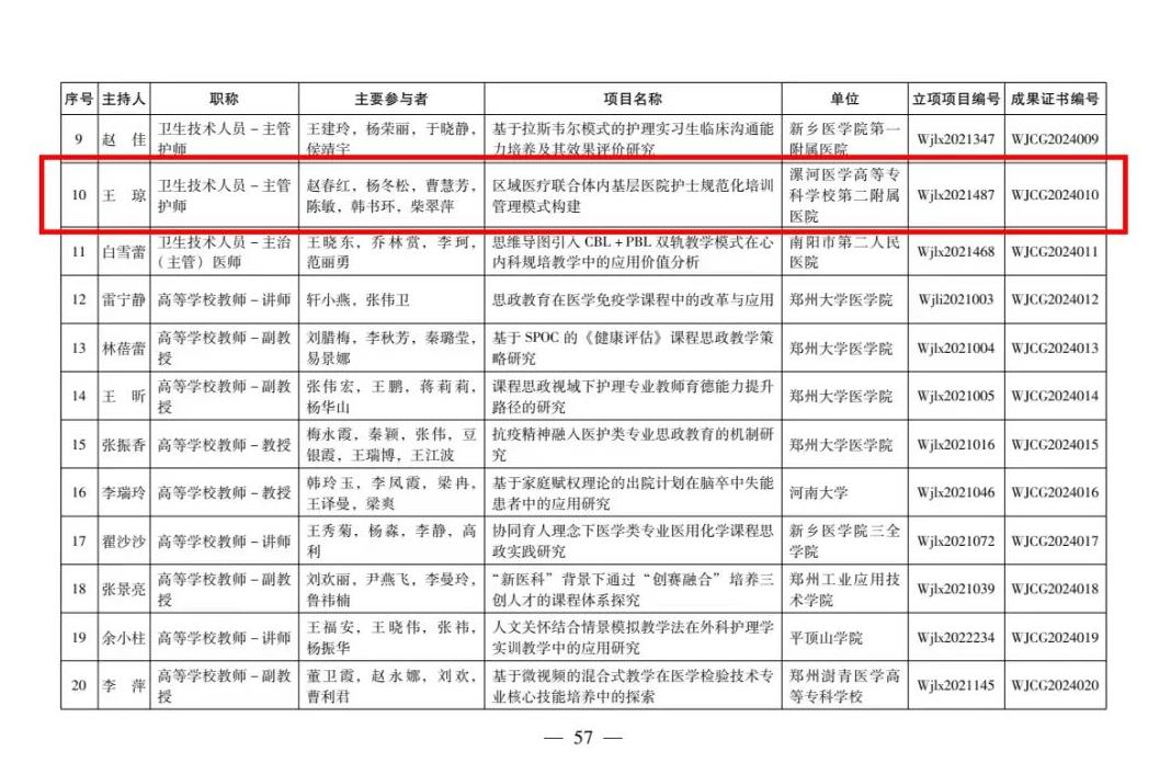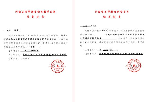 近日,河南省衛(wèi)生健康委員會下發(fā)了《關(guān)于公布2024年河南省醫(yī)學(xué)教育研究項(xiàng)目立項(xiàng)教學(xué)成果和優(yōu)質(zhì)課評選結(jié)果的通知》,由漯河市骨科醫(yī)院(漯河醫(yī)專二附院、漯河市立醫(yī)院)王瓊、趙春紅、楊冬松、曹慧芳、陳敏、韓書環(huán)、柴翠萍團(tuán)隊(duì)完成的《區(qū)域醫(yī)療聯(lián)合體內(nèi)基層醫(yī)院護(hù)士規(guī)范化培訓(xùn)管理模式構(gòu)建》項(xiàng)目完成結(jié)項(xiàng),被授予2024年河南省醫(yī)學(xué)教育優(yōu)秀教學(xué)成果一等獎(jiǎng)。