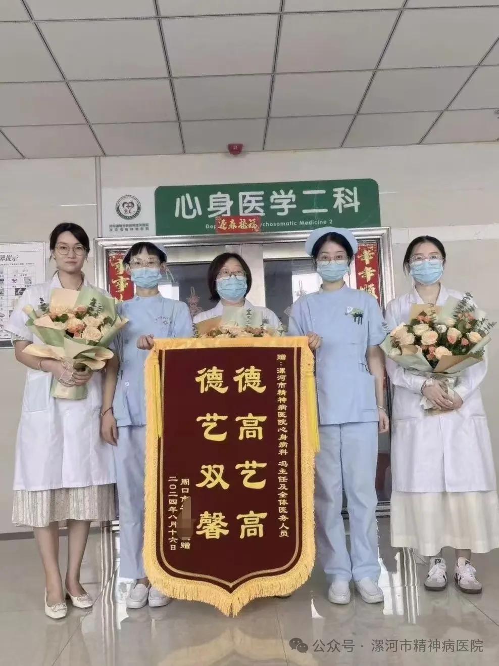 在醫(yī)師節(jié)當(dāng)天,漯河市精神病醫(yī)院心身醫(yī)學(xué)二科收到了來(lái)自周口市患者—面繡著“德高藝高,德藝雙馨”的錦旗,為醫(yī)師節(jié)增添了一抹璀璨的光彩。