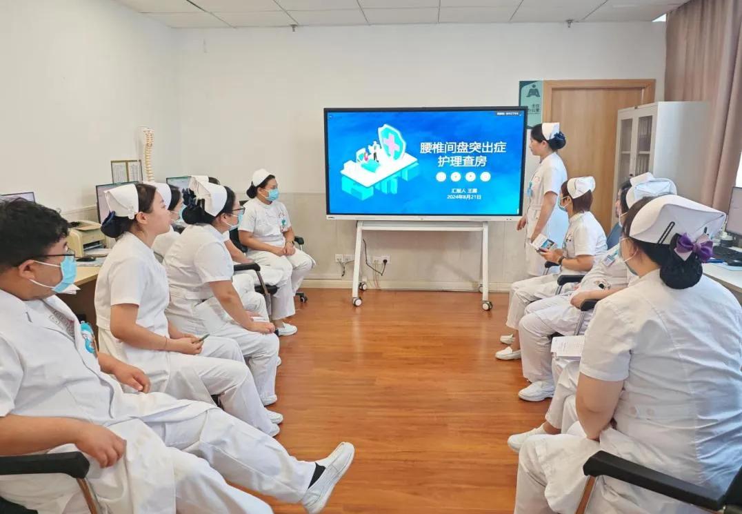 在進行護理查房前,首先由責(zé)任護士王露介紹患者的病史及疾病相關(guān)知識與治療,針對該患者的護理重點制定專業(yè)、個性化的護理管理情況,隨后責(zé)任護士帶領(lǐng)大家進行床旁查房,護士長關(guān)切的詢問了患者病情狀況,了解是否存在未解決的護理問題,并從患者實際情況出發(fā),制定出具體的護理措施。此外,護士長還交代患者術(shù)后注意事項,叮囑患者術(shù)后如何規(guī)范正確進行腰椎術(shù)后的功能鍛煉。