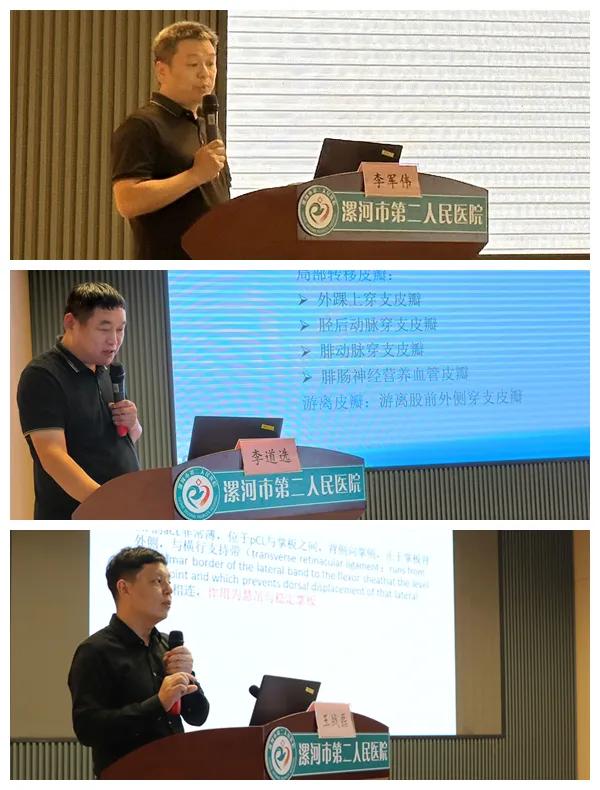 在學術(shù)交流環(huán)節(jié),河南省人民醫(yī)院手足顯微和創(chuàng)面修復外科主任謝振軍教授就“慢性創(chuàng)面的皮瓣修復”,市骨科醫(yī)院骨四科主任李俊明就“穿支皮瓣聯(lián)合Masquelet技術(shù)治療四肢骨及皮膚軟組織缺損”,市二院顯微外科主任沈衛(wèi)軍就“幾種常見的肌腱自發(fā)性離斷”,市中心醫(yī)院創(chuàng)傷骨科主任李軍偉就“超顯微技術(shù)在阿爾茨海默病中的應用進展”,市骨科醫(yī)院骨四科副主任醫(yī)師李道選就“游離股前外側(cè)穿支皮瓣修復足踝部皮膚缺損”,市二院顯微外科副主任醫(yī)師王戰(zhàn)磊就“手部側(cè)副韌帶損傷的診療方法”做了專題講座及分享交流。