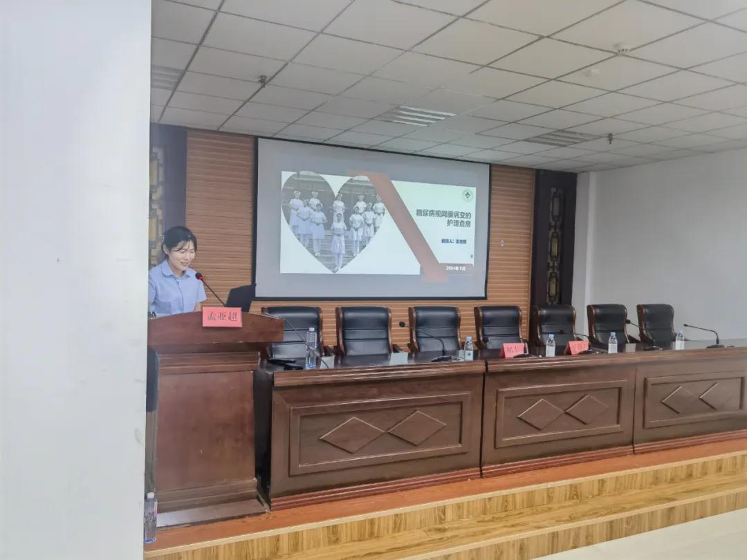 講座中,主管護師孟亞超通過一例糖尿病視網(wǎng)膜病變患者的實例,巧妙引出講座主題《糖尿病視網(wǎng)膜病變患者的術后護理查房》。她詳細介紹了護理查房的內(nèi)容、規(guī)范化流程以及如何去分析查房的重點問題和有效的實施相關護理措施。