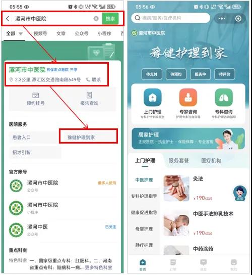 方法2:微信公眾號搜索“漯河市中醫(yī)院”,關(guān)注公眾號→點(diǎn)擊進(jìn)入“豫健護(hù)理到家”平臺