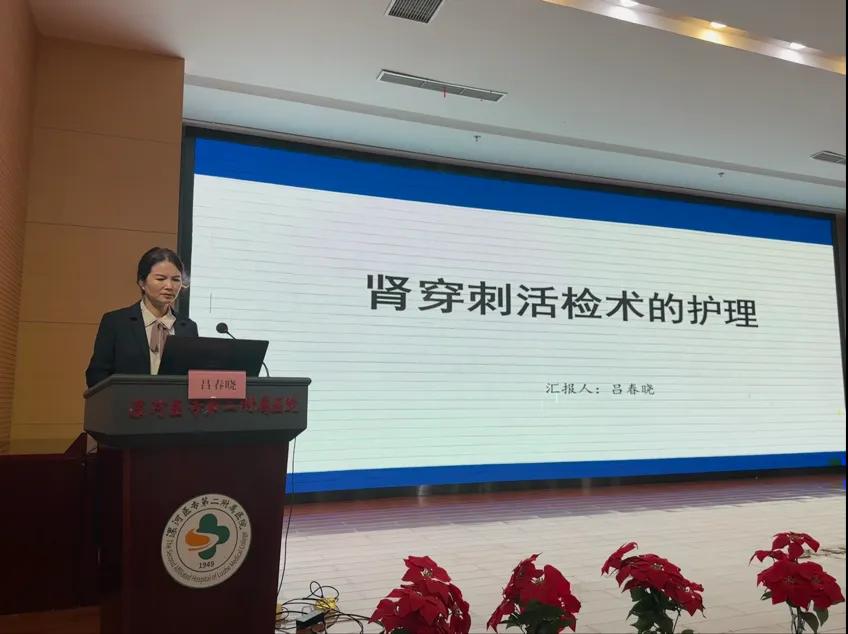 腎穿刺活檢術是腎臟病病理診斷的唯一方法,有助于進一步了解疾病的發(fā)生、發(fā)展及轉歸,血液凈化室護士長呂春曉以《腎穿刺活檢術的護理》為題,針對腎穿活檢術的目的、適應癥、禁忌癥、術前、術中、術后護理及并發(fā)癥的觀察進行講解。內(nèi)容貼近臨床,為臨床護理工作指明了方向。