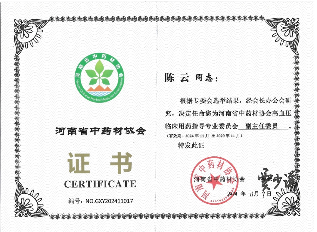 11月8日-11月9日,由河南省中西醫(yī)結(jié)合醫(yī)院、河南省高血壓中西醫(yī)結(jié)合診療中心承辦的國家繼續(xù)教育項(xiàng)目“難治性高血壓中西醫(yī)結(jié)合綜合防治培訓(xùn)班”、河南省繼續(xù)教育項(xiàng)目“中西醫(yī)結(jié)合治療難治性高血壓適宜技術(shù)培訓(xùn)班”暨河南省中藥材協(xié)會高血壓臨床用藥指導(dǎo)專業(yè)委員會成立大會在河南鄭州順利召開。會上,漯河市中醫(yī)院心病科副主任陳云被評選為河南省中藥材協(xié)會高血壓臨床用藥指導(dǎo)專業(yè)委員會副主任委員。