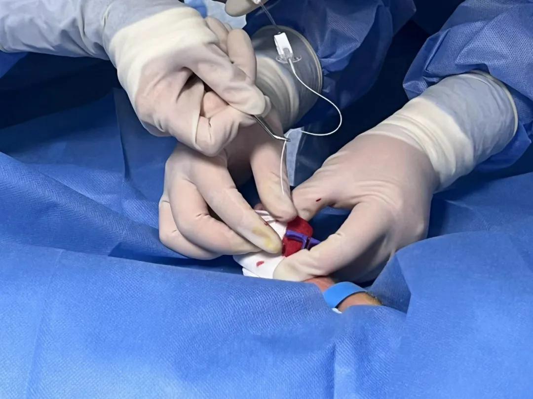 下午 16點(diǎn),在護(hù)理部副主任曹慧芳的指導(dǎo)下,兒科李紅護(hù)士長與趙曙光精心進(jìn)行置管前準(zhǔn)備,血液凈化室呂春曉護(hù)士長和腫瘤血液科于楊波護(hù)士長全力協(xié)助,每一個(gè)細(xì)節(jié)都彰顯著團(tuán)隊(duì)的默契與協(xié)作。醫(yī)護(hù)人員全神貫注地為小天使進(jìn)行 PICC 置管穿刺。他們的每一個(gè)動(dòng)作都精準(zhǔn)而溫柔,仿佛在雕琢一件稀世珍寶,因?yàn)槲覀兩钪?,這是守護(hù)新生命的關(guān)鍵一步。