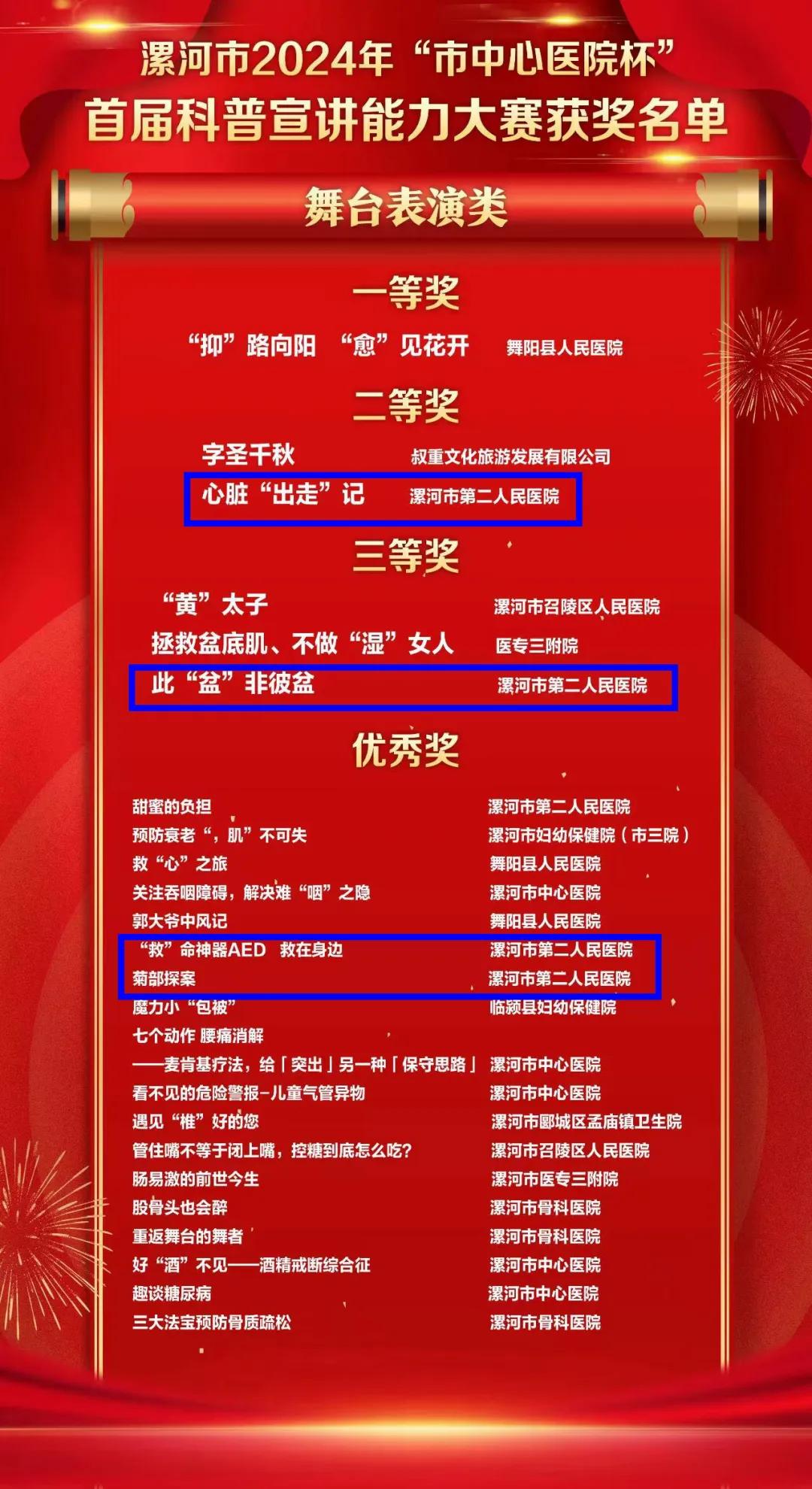 12月18日,由中共漯河市委宣傳部、中共漯河市委人才工作領導小組辦公室、漯河市科學技術協(xié)會、漯河市衛(wèi)生健康委員會聯(lián)合主辦,漯河市中心醫(yī)院冠名,漯河日報社承辦的漯河市2024年“市中心醫(yī)院杯”首屆科普宣講能力大賽決賽落下帷幕。經過激烈角逐,市二院精心選送的參賽作品由劉橋、李媛、安自譚、袁泉、任崢崢出演的《心臟“出走”記》榮獲舞臺表演類二等獎;由井紅鴿、李靜麗、鄭家珍、丁歡歡、程亞麗出演的《此“盆”非彼“盆”》榮獲舞臺表演類三等獎;另有四個參賽作品榮獲優(yōu)秀獎。