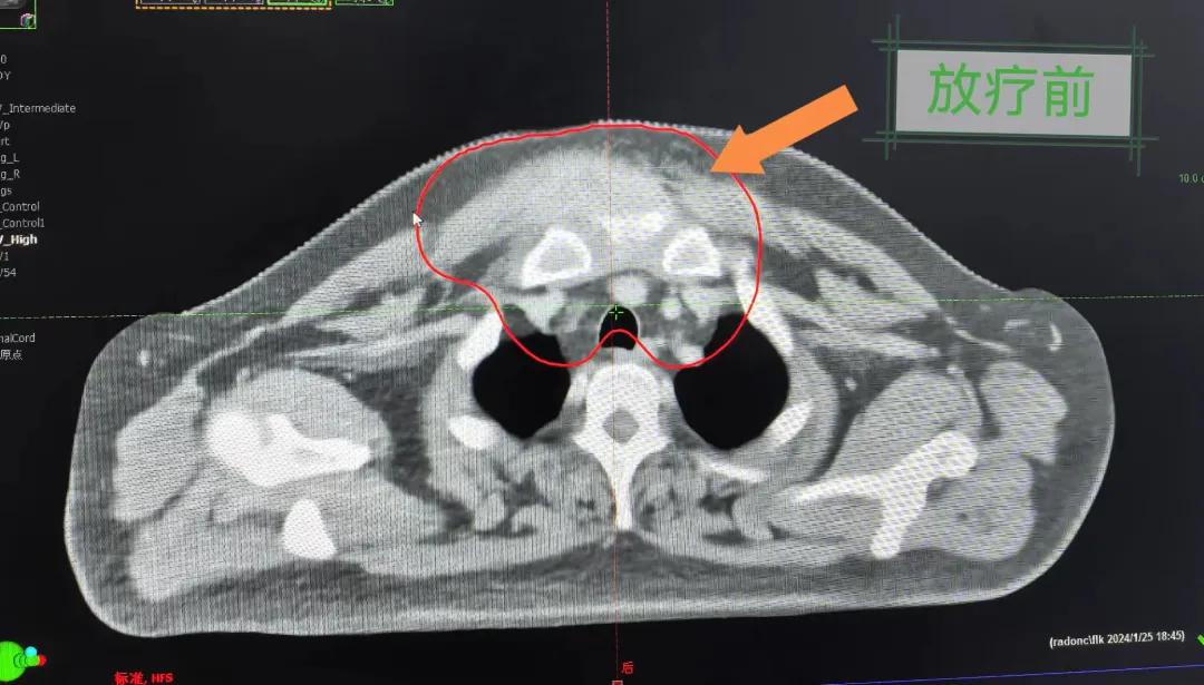 患者經(jīng)多方咨詢與打聽,在家屬的陪同下來到市二院放療科找到趙亮主任尋求幫助。入院后迅速完善了相關檢查,診斷為罕見的“胸壁腫瘤”。因腫瘤體積大,侵犯周圍組織,手術治療難度較大,經(jīng)院內(nèi)多學科會診后,決定采用無創(chuàng)的局部放射治療。在初步告知患者及家屬治療方案時,病人及家屬都擔心預后及放療可能引起的不適,趙亮主任詳細且耐心的向家屬和病人講述放療過程中可能出現(xiàn)的不良反應,確保讓他們安心治療。