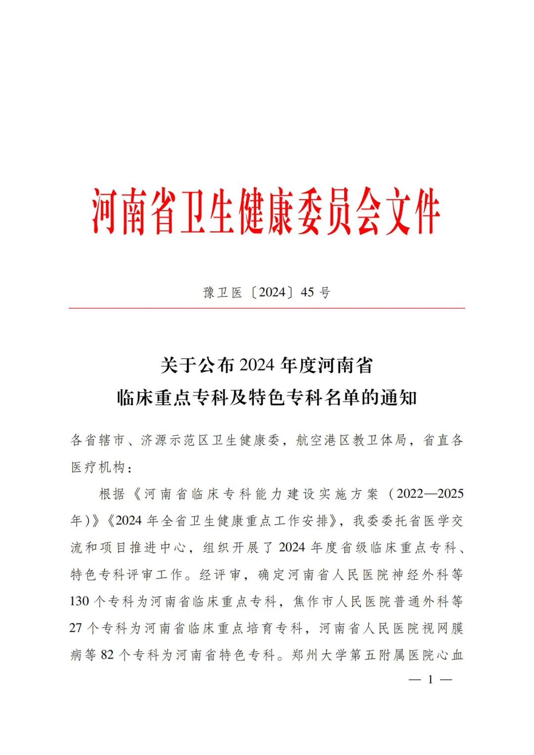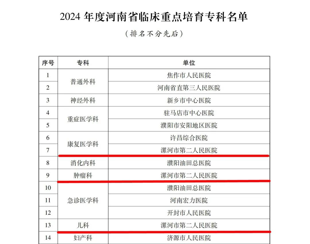 12月24日,河南省衛(wèi)生健康委下發(fā)了《關(guān)于公布2024年度河南省臨床重點(diǎn)??萍疤厣珜?泼麊蔚耐ㄖ罚ㄔバl(wèi)醫(yī)〔2024〕45號(hào))。市二院兒科、腫瘤科(腫瘤放療科、腫瘤內(nèi)科)、康復(fù)醫(yī)學(xué)科成功通過評(píng)審,被確定為河南省臨床重點(diǎn)培育專科。