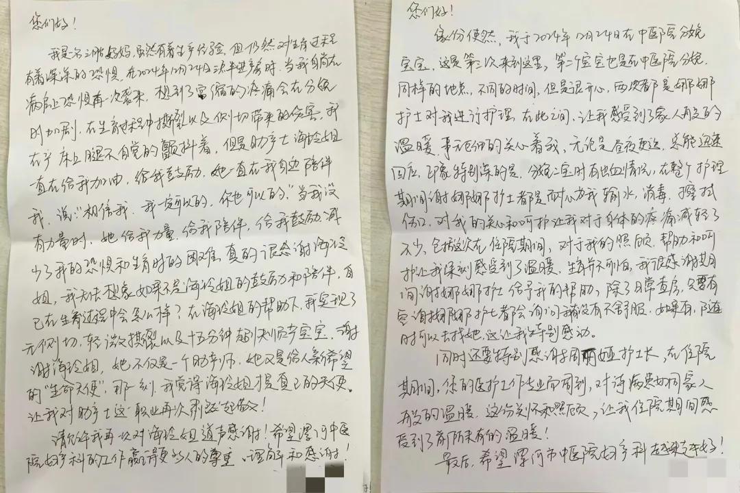 手寫的感謝信表達(dá)了對護(hù)士長周麗婭暖心細(xì)致的全程護(hù)理服務(wù),助產(chǎn)士朱海玲專業(yè)的助產(chǎn)技術(shù)及心理支持,助力寶寶平安生產(chǎn)以及謝娜娜護(hù)士耐心細(xì)致的護(hù)理和陪伴,讓她十分感動(dòng),住院期間感受到了家的溫暖和如親人般的陪伴。這些都如涓涓細(xì)流滋潤著寶媽和家屬的心田,并以寫信的方式表達(dá)對婦產(chǎn)科團(tuán)隊(duì)優(yōu)質(zhì)護(hù)理服務(wù)的認(rèn)可。