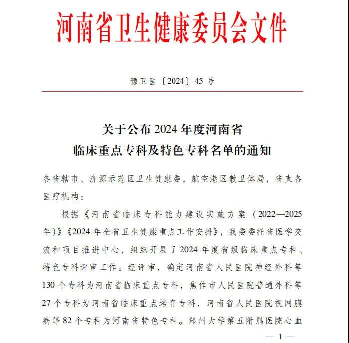 12月24日,河南省衛(wèi)生健康委下發(fā)《關(guān)于公布2024年度河南省臨床重點(diǎn)??萍疤厣珜?泼麊蔚耐ㄖ罚ㄔバl(wèi)醫(yī)〔2024〕45號(hào))。漯河醫(yī)專高等??茖W(xué)校第二附屬醫(yī)院運(yùn)動(dòng)醫(yī)學(xué)科、護(hù)理??瞥晒νㄟ^評(píng)審,被確定為河南省臨床重點(diǎn)培育???。