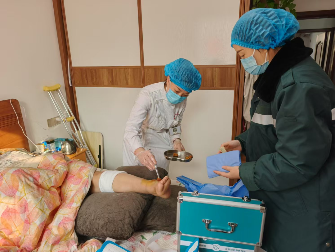 接到任務(wù)后,張燕燕護(hù)士長帶領(lǐng)科室主管護(hù)師孟丹丹一起按照約定時間上門服務(wù),在對患者做了系統(tǒng)的傷口評估后,嚴(yán)格按照操作標(biāo)準(zhǔn),動作輕柔又利落地對傷口進(jìn)行了創(chuàng)面消毒、換藥、包扎,同時耐心為患者及家屬講解了傷口居家護(hù)理的注意事項及患肢的功能鍛煉要點等。