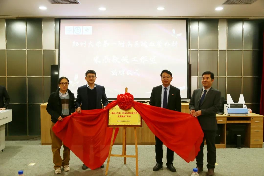 鄭州大學(xué)第一附屬醫(yī)院血管外科宋燕教授、鄭州大學(xué)第一附屬醫(yī)院血管外科劉衛(wèi)萍教授、漯河醫(yī)專(zhuān)二附院黨委書(shū)記柴運(yùn)洪、漯河醫(yī)專(zhuān)二附院急診外科主任史永濤共同為鄭州大學(xué)第一附屬醫(yī)院血管外科宋燕教授工作室揭牌。