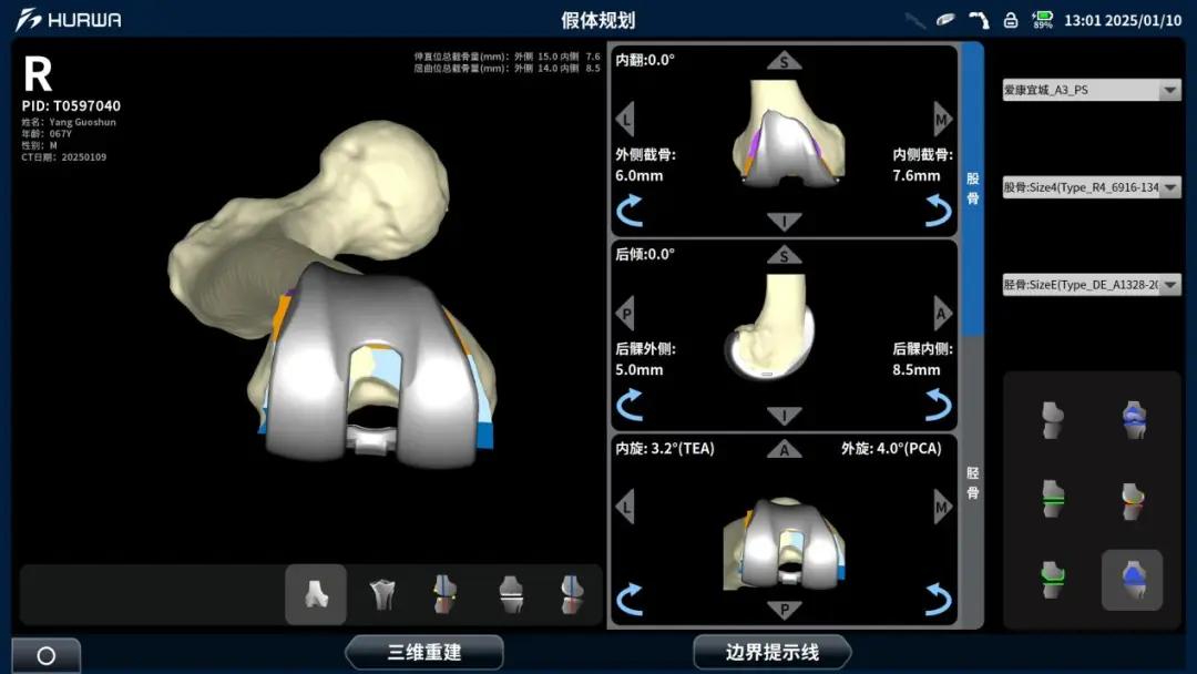 該患者是一位膝關(guān)節(jié)骨性關(guān)節(jié)病的男性,他的膝關(guān)節(jié)疼痛時間有10年之久,在當(dāng)?shù)亟?jīng)過反復(fù)的治療,針灸,外敷膏藥,打封閉針等保守治療,效果不佳,并且癥狀越來越重,以至于嚴重影響正常生活和活動。后來經(jīng)過親戚的介紹,患者來到了漯河市骨科醫(yī)院關(guān)節(jié)外科門診,經(jīng)過李付彬主任醫(yī)師詳細檢查,膝關(guān)節(jié)軟骨和半月板損傷較重,膝關(guān)節(jié)出現(xiàn)了內(nèi)翻畸形,經(jīng)過李主任團隊的討論確定了詳細的治療方案,一致認為可以在機器人輔助下進行膝關(guān)節(jié)表面置換術(shù)。在整個手術(shù)過程中完全是按照術(shù)前規(guī)劃進行,手術(shù)過程非常順利。目前患者已經(jīng)開始下床負重進行康復(fù)訓(xùn)練了。