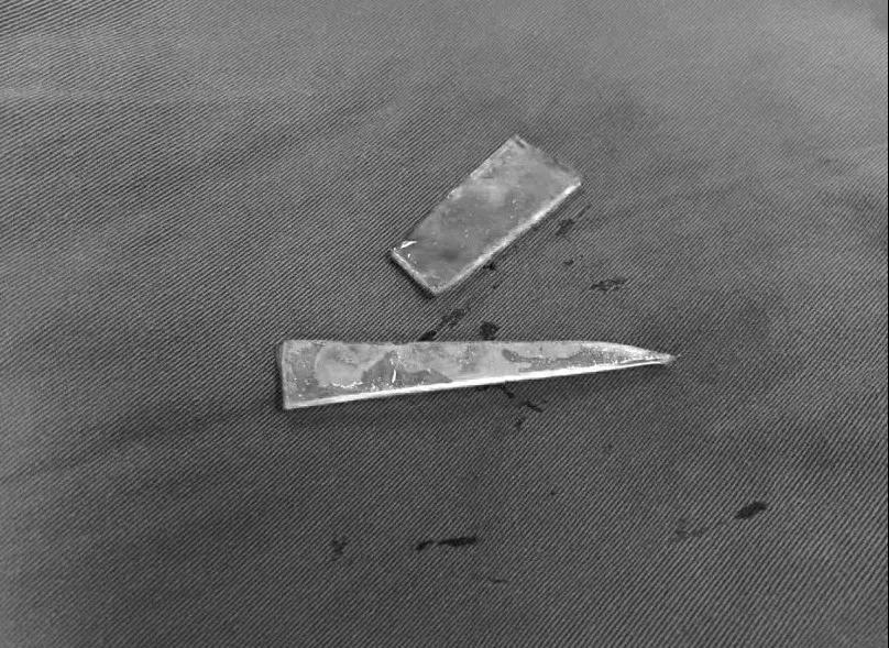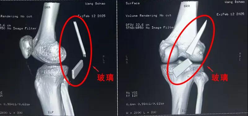 患者家屬這才開(kāi)始意識(shí)到問(wèn)題的嚴(yán)重性,便帶著孩子到鄉(xiāng)鎮(zhèn)衛(wèi)生院檢查——結(jié)果顯示右膝關(guān)節(jié)后方竟然殘留著兩塊兒鋒利的碎玻璃,測(cè)量后預(yù)估玻璃總長(zhǎng)將近13厘米!