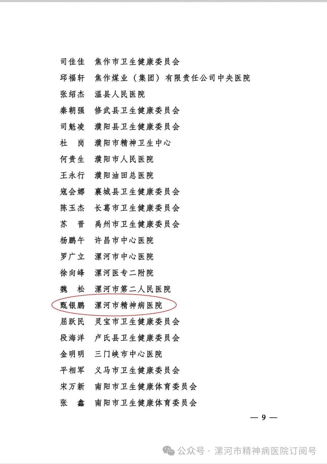 近日河南省健康委員會關(guān)于表揚(yáng)2024年度全省醫(yī)政和護(hù)理工作表現(xiàn)突出集體和個(gè)人的通報(bào)中,漯河市精神病醫(yī)院醫(yī)務(wù)科科長甄銀鵬榮獲“全省醫(yī)政工作表現(xiàn)突出個(gè)人”