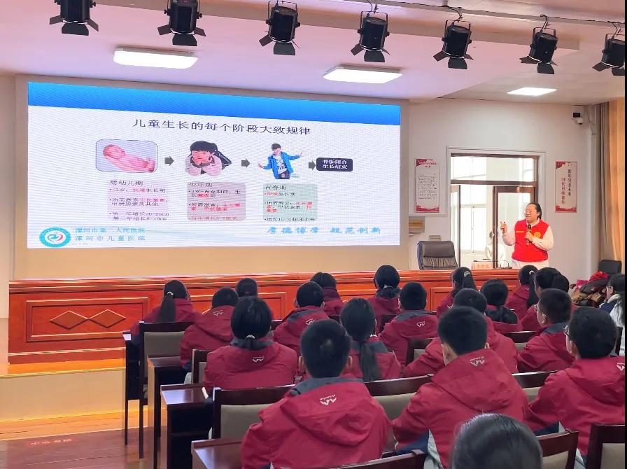 活動現(xiàn)場,市二院兒童保健科副主任李錦璐就《生活中長高的秘訣》,特別強調(diào)了身體健康的重要性,詳細(xì)介紹了兒童身高發(fā)育的成因、危害以及預(yù)防措施。引導(dǎo)同學(xué)們樹立正確的飲食觀念,鼓勵大家多參與戶外活動,保持健康的生活方式;副主任醫(yī)師郭鳳仙圍繞《青少年心理健康》針對心理行為異常問題,以通俗易懂的語言幫助同學(xué)們正確認(rèn)識青春期可能出現(xiàn)的心理變化,引導(dǎo)大家學(xué)會積極應(yīng)對學(xué)習(xí)和生活中的壓力與挑戰(zhàn),保持樂觀向上的心態(tài)。