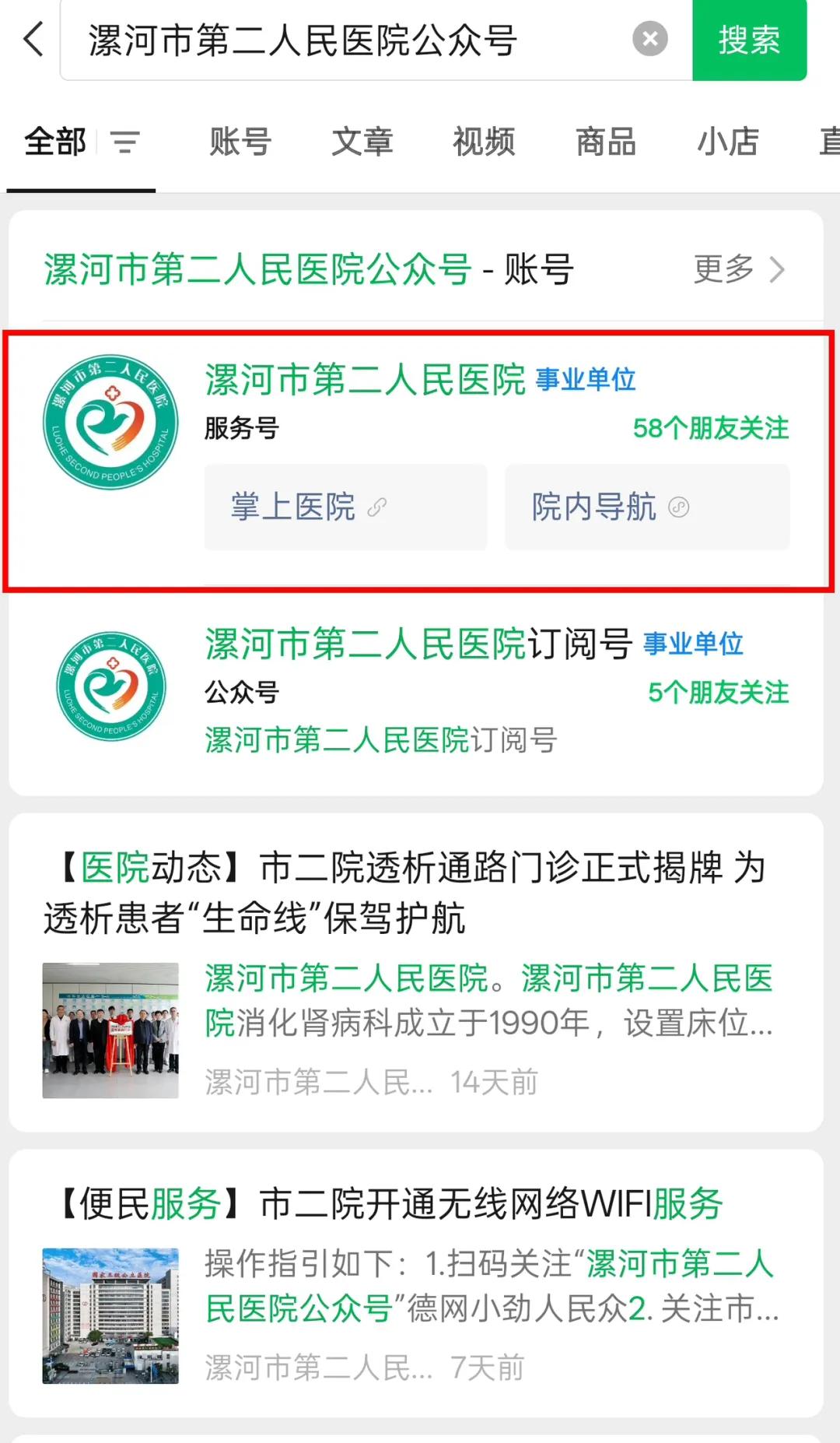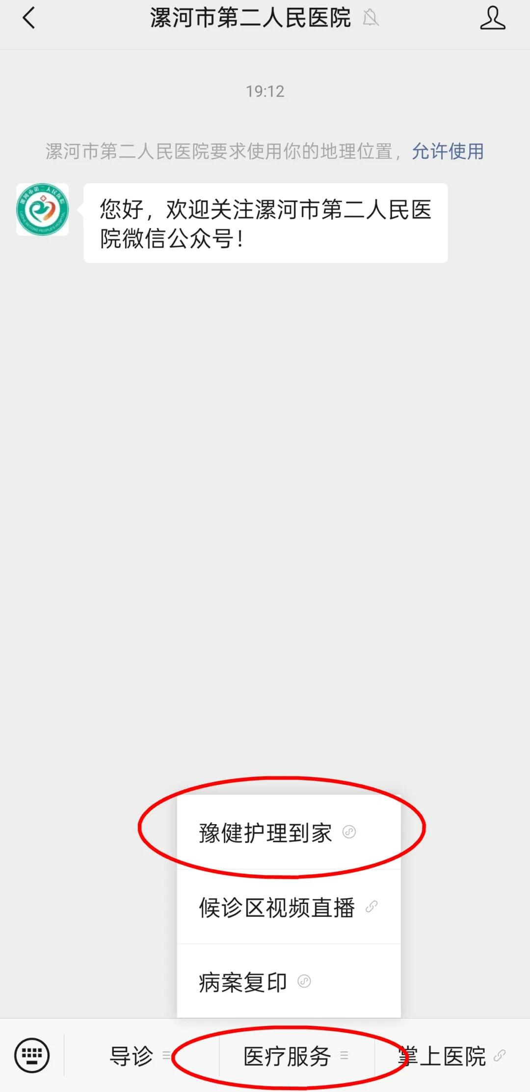 方法一:微信搜索“漯河市第二人民醫(yī)院”公眾號進(jìn)入主頁面,關(guān)注服務(wù)號之后,點(diǎn)擊醫(yī)療服務(wù)→豫健護(hù)理到家項(xiàng)目。