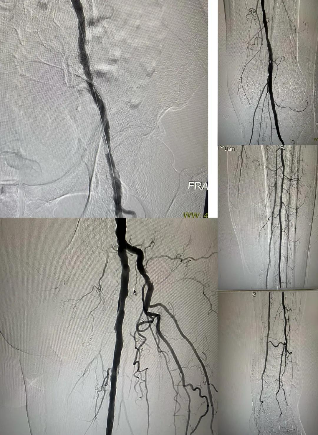 患者,男,73歲,約15天前出現(xiàn)左側(cè)腳面腫痛,間歇性跛行,左足第三足趾壞疽,遂來市中醫(yī)院就診,以“下肢動脈硬化閉塞、糖尿病足壞疽、”收住外二科,評估患者病情后需實施左下肢球囊擴張成形術(shù)。術(shù)中造影見患者左側(cè)髂動脈、股淺動脈階段性重度狹窄。經(jīng)外周球囊擴張術(shù)后,再次造影見股淺動脈、髂動脈血流通暢,膝下及足部血流速度較前改善。