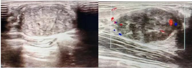 橢圓形低回聲團塊,包膜完整,內部回聲均勻,后方回聲增強,周邊無“蟹足樣”浸潤。