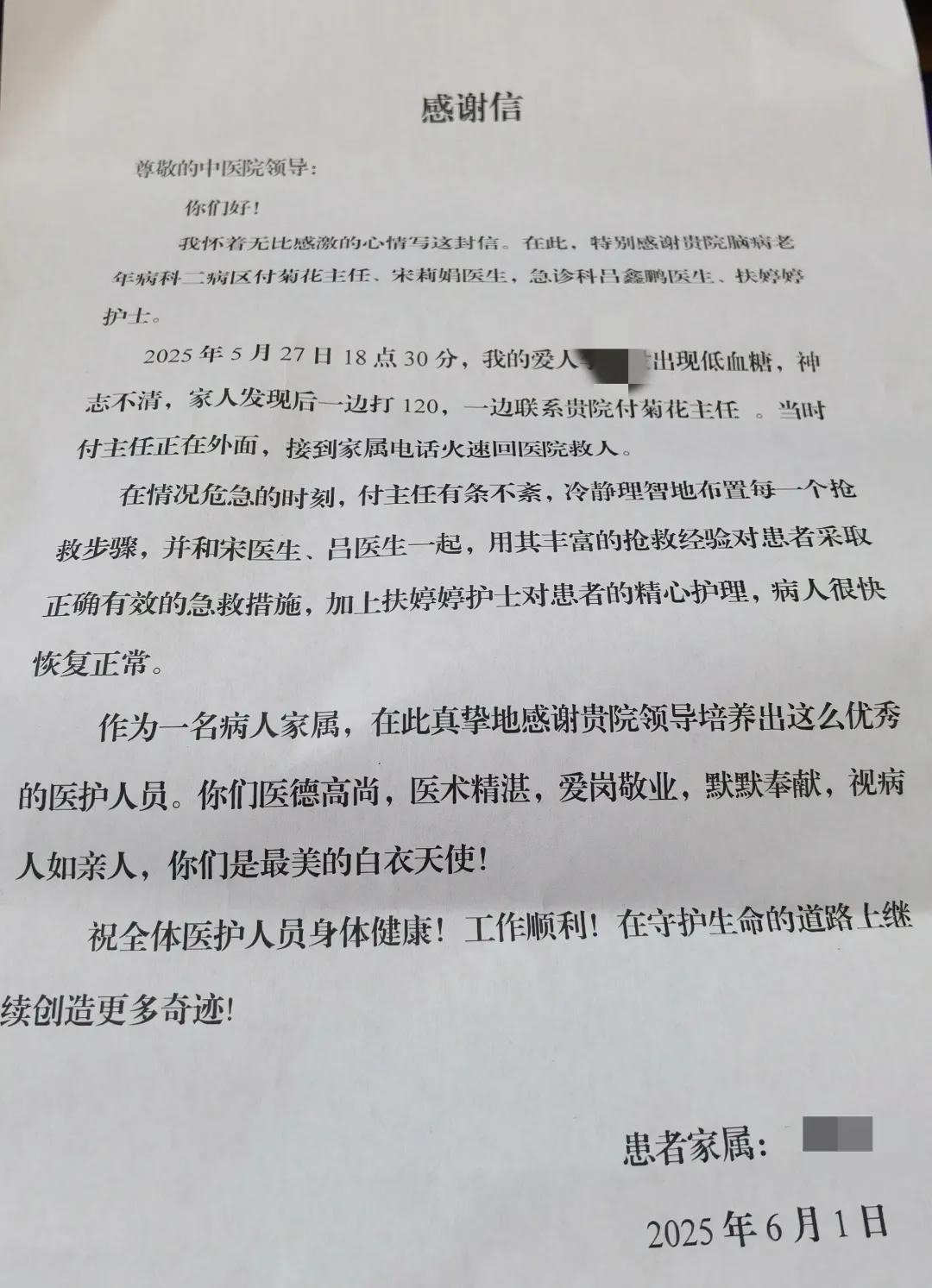 據(jù)了解,該女士其丈夫患腦血管疾病,曾在市中醫(yī)院腦二科就診,是腦二病區(qū)付菊花主任的病人,后多次到腦二科找付醫(yī)生復(fù)診。5月27日晚,患者病情危急,患者家屬趕忙聯(lián)系付菊花,付菊花當(dāng)時(shí)已下班回家,她接到電話后立即與院急診科和腦二科宋莉娟醫(yī)生聯(lián)系開展相關(guān)救治工作并抓緊到醫(yī)院參與救治,還用“醫(yī)生全年無休守護(hù)患者”的暖心話語安慰焦急的患者家屬。急診科的呂鑫鵬、扶婷婷也對(duì)患者采取正確有效的急救措施及精心護(hù)理,經(jīng)過各科室的精心救治,患者癥狀快速好轉(zhuǎn),病人家屬特送來信表示感謝。