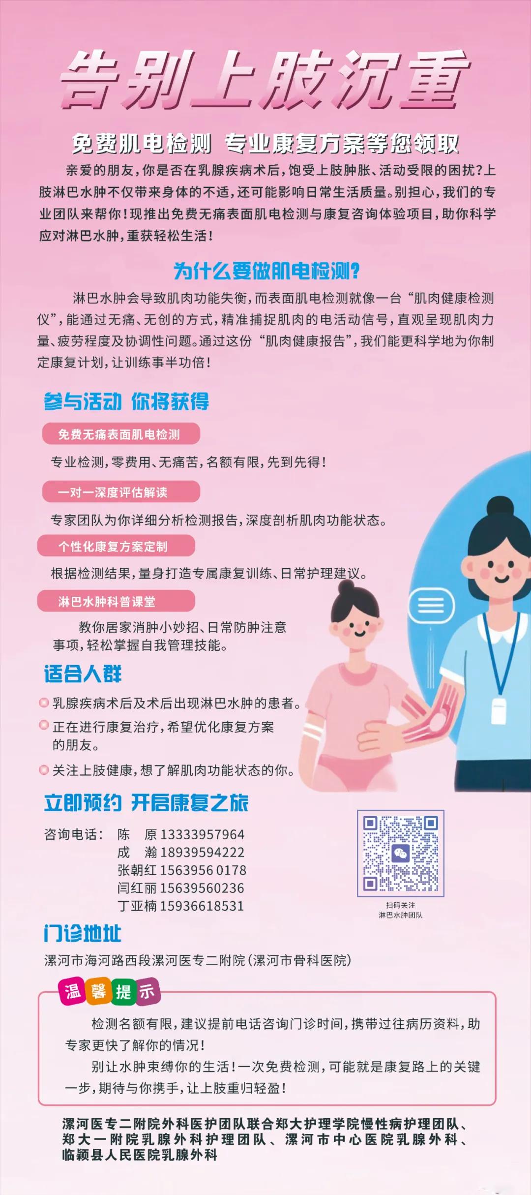 漯河醫(yī)專二附院聯(lián)合省市級多專家團隊推出公益項目,于6月20日開放免費無痛檢測名額,含一對一報告解讀與康復(fù)指導(dǎo),助您科學(xué)應(yīng)對水腫困擾。立即致電咨詢預(yù)約,讓專業(yè)團隊為您的上肢健康保駕護航!