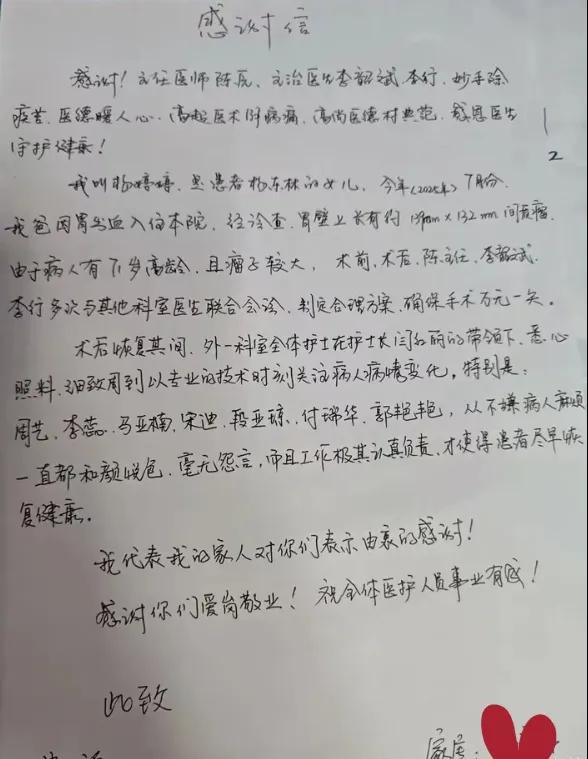 這封感謝信,是對普通外科全體醫(yī)護人員,尤其是對護理團隊辛勤付出和專業(yè)精神的高度認可與鼓勵。對團隊而言,患者的康復(fù)和家屬的滿意是他們最大的追求。普通外科團隊將繼續(xù)秉承“以患者為中心”的服務(wù)理念,不斷精進醫(yī)療技術(shù),提升護理服務(wù)質(zhì)量,尤其是加強復(fù)雜、高齡患者圍手術(shù)期的精細化、人性化護理管理,用精湛的醫(yī)術(shù)祛除病痛,用溫暖的仁心守護健康,為更多患者帶來康復(fù)的希望和家的溫暖。(盧 闖 閆紅麗 劉 旭 袁錦鈺)