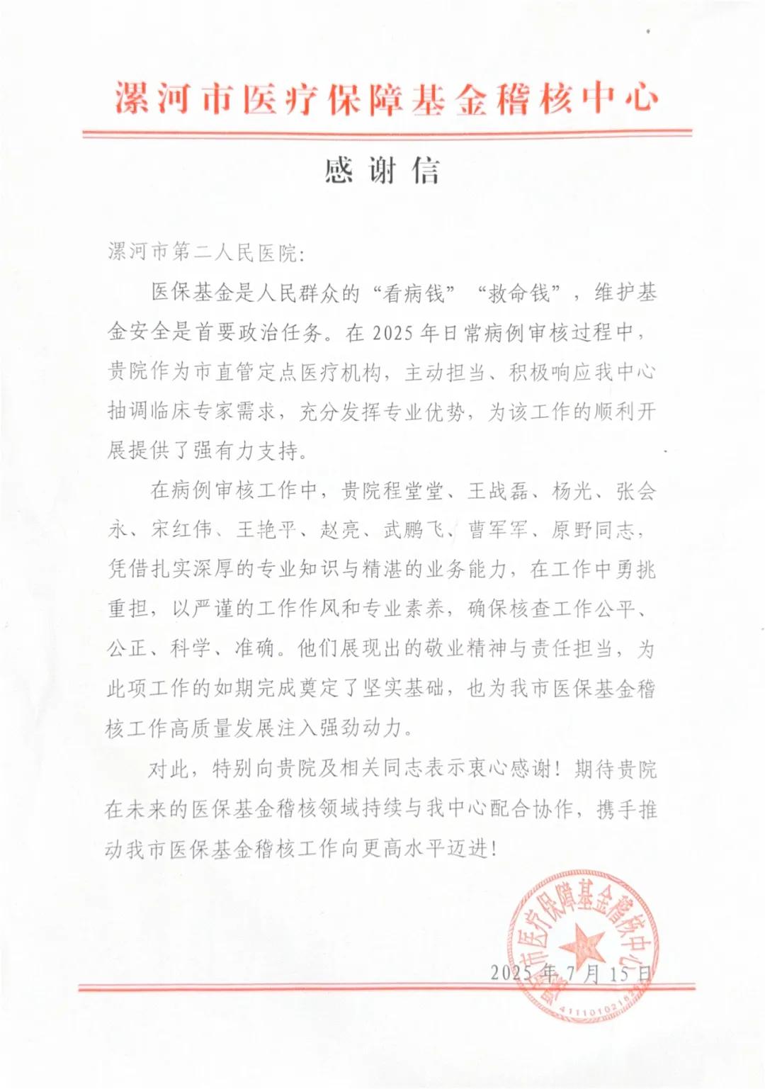 近日,市醫(yī)療保障基金稽核中心向市二院發(fā)來感謝信,對醫(yī)院選派多名業(yè)務(wù)骨干協(xié)助開展2025年日常病例審核工作表示感謝,信中高度評價市二院專家團隊以扎實的臨床功底和嚴謹?shù)墓ぷ髯黠L(fēng),高效完成病例合規(guī)性審查,為醫(yī)?;鸨O(jiān)管提供重要技術(shù)支持,并對醫(yī)院長期以來在醫(yī)保政策落實、醫(yī)療質(zhì)量管控方面的工作成效給予充分肯定。