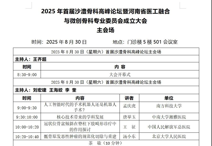 為進一步推動河南省醫(yī)工融合與微創(chuàng)骨科領域的創(chuàng)新發(fā)展,加速實現診療流程的規(guī)范化與精準化,助力業(yè)內同仁及時掌握國內外該領域前沿動態(tài),深入學習新理念、新知識和新技術,經醫(yī)工融合與微創(chuàng)骨科專業(yè)委員會籌備組審慎研討,現定于2025年8月30日-31日在漯河召開首屆沙澧骨科高峰論壇暨河南省物理醫(yī)學學會醫(yī)工融合與微創(chuàng)骨科專業(yè)委員會成立大會。誠邀國內外骨科領域專家學者齊聚漯河,共探學術前沿、共話發(fā)展機遇、共繪學科新藍圖?,F將會議相關事宜通知如下: