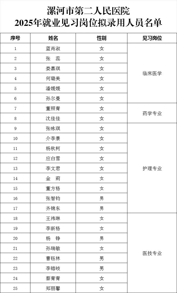 【公示】漯河市第二人民醫(yī)院2025年就業(yè)見習(xí)崗位擬錄用人員通知