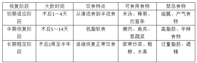 1.術(shù)后第1~2天,腸道功能尚未恢復(fù),此時通常需要禁食,待腸蠕動恢復(fù)、肛門排氣后,可開始進食清流食。