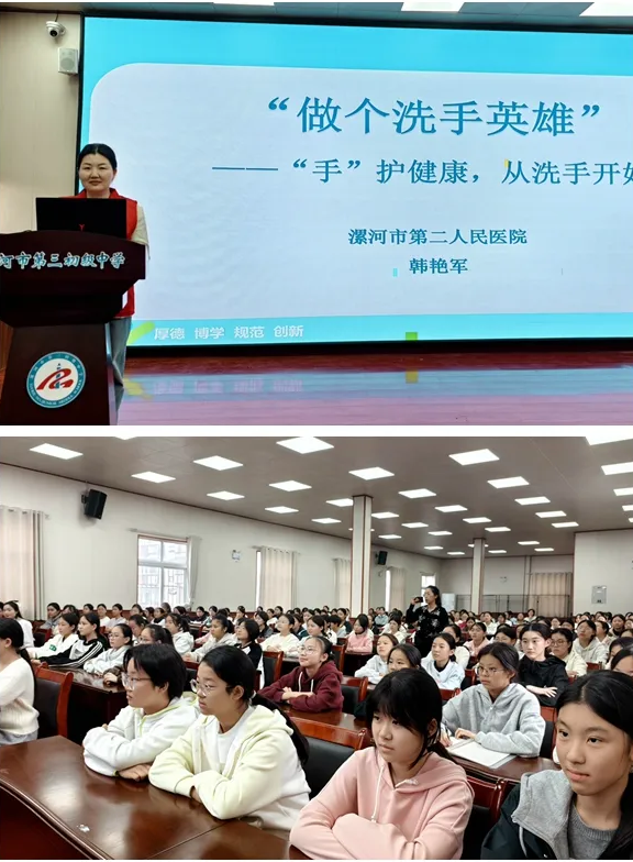 此外,市二院感控辦工作人員專程走進(jìn)市第三初級(jí)中學(xué),為學(xué)生們帶來了一場別開生面的手衛(wèi)生知識(shí)講座。工作人員以“手”護(hù)健康為切入點(diǎn),通過專題講座、播放宣傳視頻、講解洗手重要性、演示“七步洗手法”等環(huán)節(jié),深入淺出地向同學(xué)們闡述了洗手這一最簡單、經(jīng)濟(jì)且有效的健康守護(hù)方法,有效提升了青少年群體的手衛(wèi)生知識(shí)與自我防護(hù)能力。