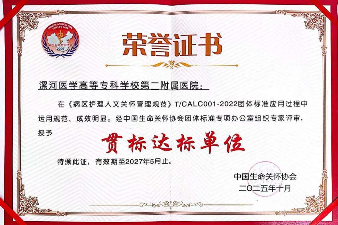 10月30日—11月2日,由國(guó)家生命關(guān)懷協(xié)會(huì)主辦、華中科技大學(xué)同濟(jì)醫(yī)學(xué)院附屬協(xié)和醫(yī)院承辦的國(guó)家級(jí)繼續(xù)教育項(xiàng)目“醫(yī)院護(hù)理人文關(guān)懷標(biāo)準(zhǔn)化建設(shè)”會(huì)議在武漢召開(kāi)。此次大會(huì)以“關(guān)懷實(shí)踐 標(biāo)準(zhǔn)引領(lǐng)”為主題,匯聚了來(lái)自29個(gè)?。ㄊ小⒆灾螀^(qū))的護(hù)理界領(lǐng)導(dǎo)與專(zhuān)家,共同探討與展示醫(yī)學(xué)人文關(guān)懷標(biāo)準(zhǔn)化建設(shè)的前沿理論與實(shí)踐成果。在備受矚目的授牌儀式環(huán)節(jié),大會(huì)正式公布了《病區(qū)護(hù)理人文關(guān)懷管理規(guī)范》團(tuán)體標(biāo)準(zhǔn)第二批貫標(biāo)驗(yàn)收評(píng)審結(jié)果,并現(xiàn)場(chǎng)為達(dá)標(biāo)單位授牌、頒發(fā)證書(shū)。漯河醫(yī)專(zhuān)二附院(漯河市骨科醫(yī)院、漯河市立醫(yī)院)憑借在人文護(hù)理領(lǐng)域扎實(shí)的工作成效和卓越的服務(wù)水平,成功通過(guò)評(píng)審,被正式授予“《病區(qū)護(hù)理人文關(guān)懷管理規(guī)范》團(tuán)體標(biāo)準(zhǔn)貫標(biāo)達(dá)標(biāo)單位”。