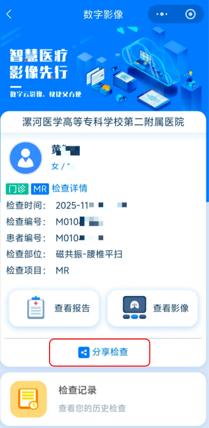 06 如果想要把患者影像資料分享給他人,請?jiān)诨颊邫z查登錄頁內(nèi)點(diǎn)擊“分享檢查”。