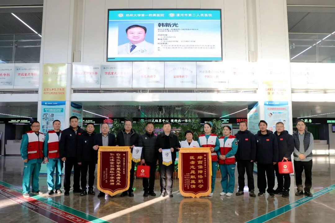 1月7日上午,市紅十字會(huì)黨組成員、副會(huì)長(zhǎng)李世杰,市足球協(xié)會(huì)主席張運(yùn)華、副主席黃旭威,市足球協(xié)會(huì)副主席、漯河水源隊(duì)領(lǐng)隊(duì)駱朝選,市足協(xié)協(xié)會(huì)副主席、漯河水源隊(duì)主教練楚青山等一行,專(zhuān)程把寫(xiě)有“白衣執(zhí)甲彰顯志愿者風(fēng)采,仁心濟(jì)世弘揚(yáng)紅十字精神”“綠蔭保障恪職守,醫(yī)者志愿獻(xiàn)真情”的兩面錦旗送到了市二院,以此感謝醫(yī)院在“河南省黃河足球‘健殘融合’冠軍聯(lián)賽”賽事中提供的專(zhuān)業(yè)醫(yī)療保障。市二院黨委書(shū)記魏松,黨委副書(shū)記、院長(zhǎng)胡海英攜班子成員接受了錦旗。