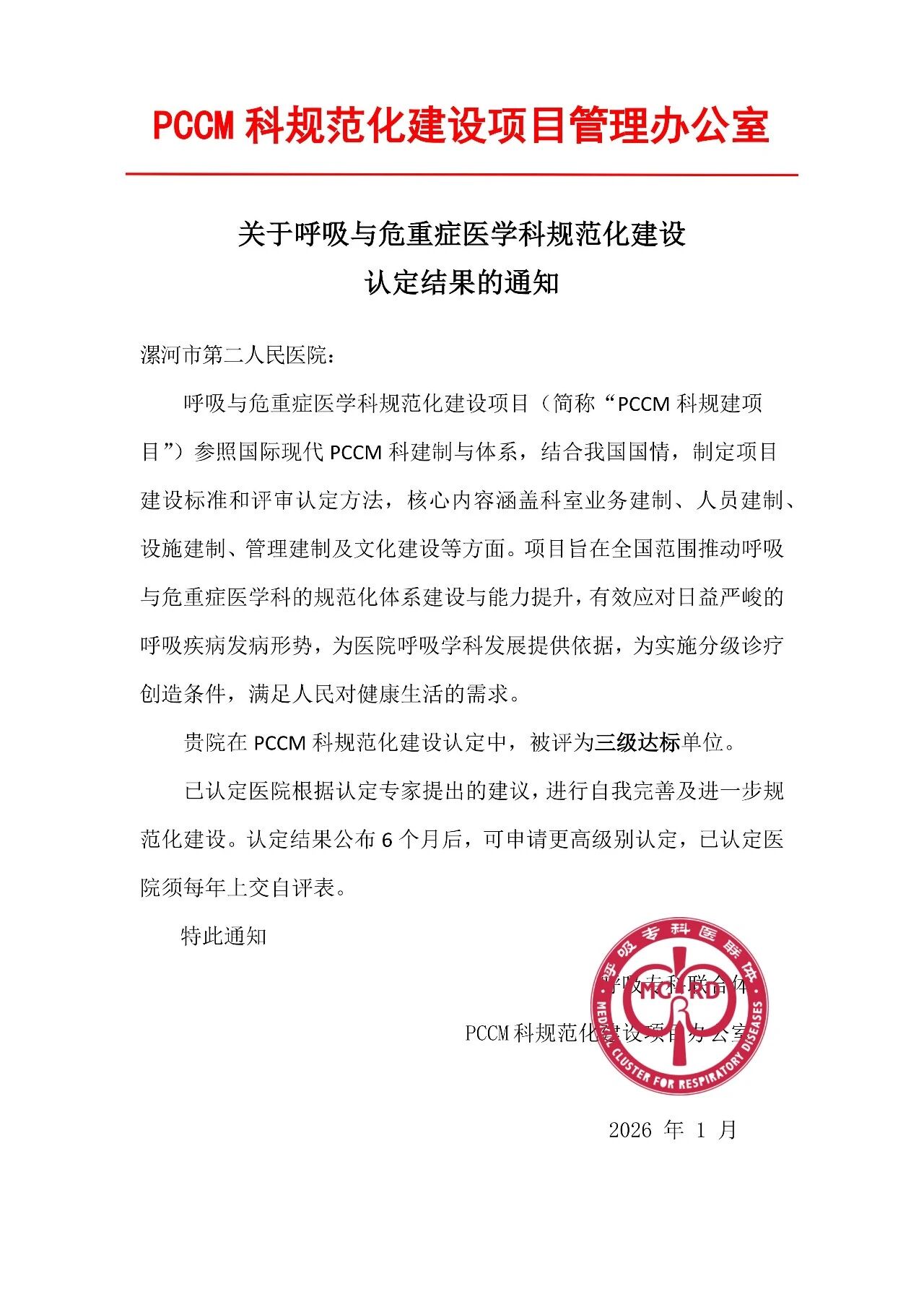 2026年1月10-11日,2026年中國(guó)呼吸學(xué)科發(fā)展大會(huì)在北京召開。會(huì)上,公布了2025年度呼吸與危重癥醫(yī)學(xué)科(PCCM)評(píng)審結(jié)果,漯河市第二人民醫(yī)院呼吸與危重癥醫(yī)學(xué)科達(dá)到三級(jí)醫(yī)院呼吸學(xué)科達(dá)標(biāo)標(biāo)準(zhǔn)。